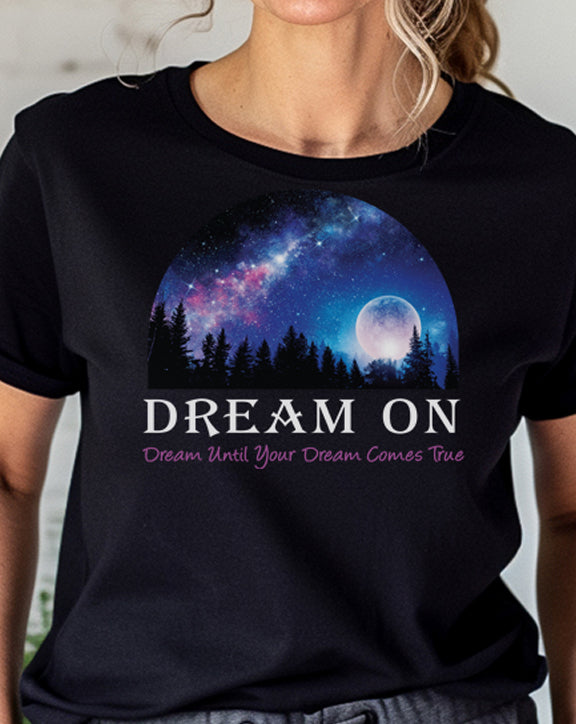 DREAM ON DREAM UNTIL YOUR DREAM COMES TRUE. This unisex t-shirt is soft and comfy with the right amount of stretch making it flattering for all. Under the Natureful Soul private label, it is made of lightweight, pre-shrunk fabric from 100% combed ring-spun cotton in black.