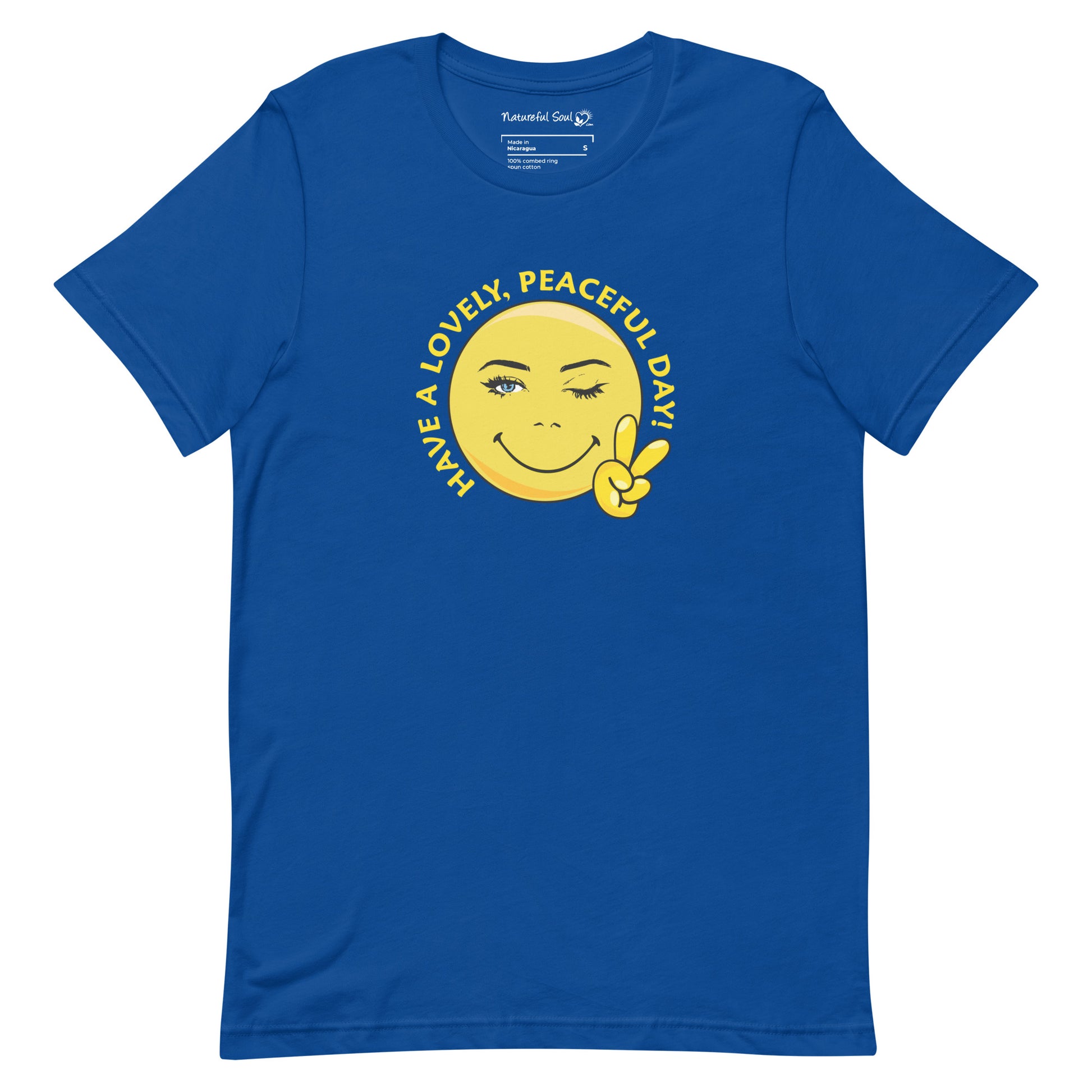 HAPPY FACE HAVE A LOVELY PEACEFUL DAY. This unisex t-shirt is soft and comfy with the right amount of stretch making it flattering for all. Under the Natureful Soul private label, it is made of lightweight, pre-shrunk fabric from 100% combed ring-spun cotton. Choose from 4 colors: black, red, true royal blue, or asphalt.