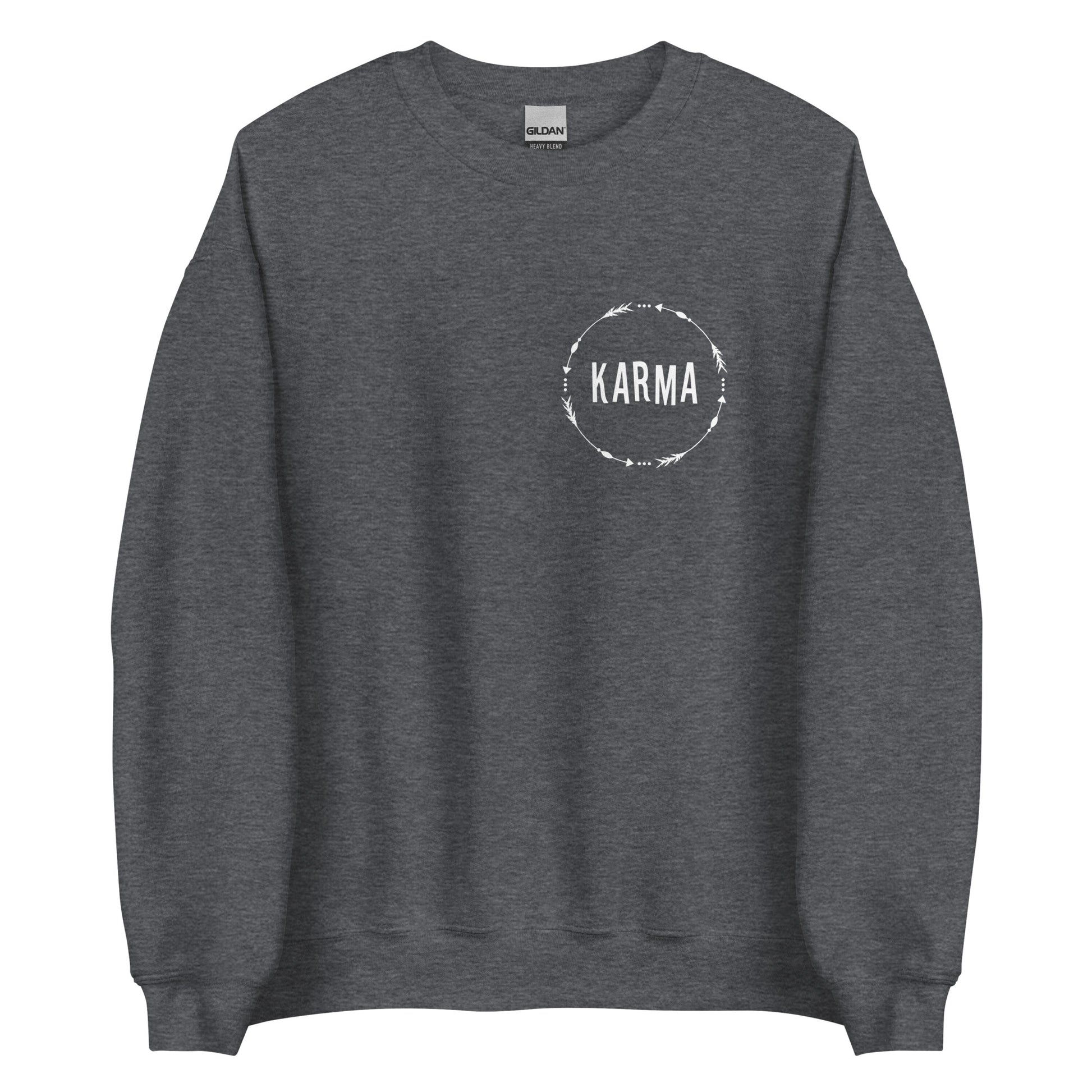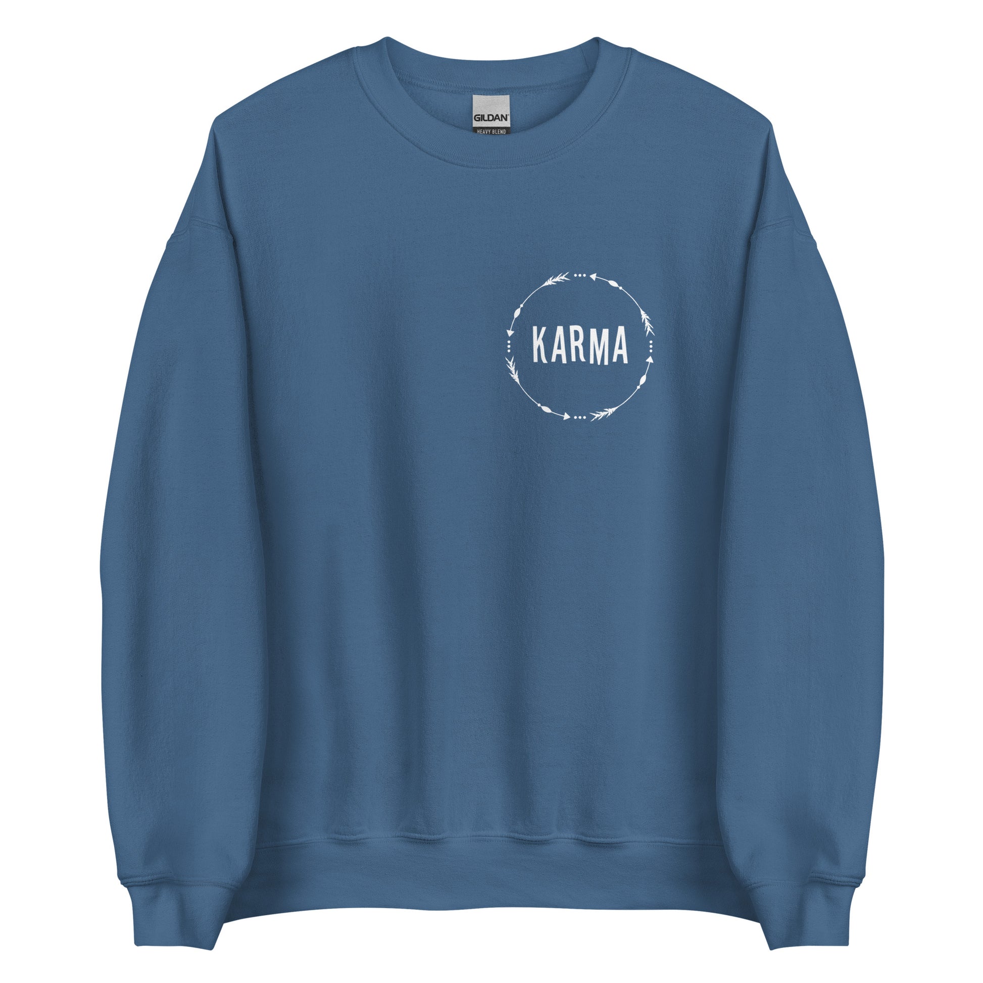 KARMA - WATCH YOUR BACK. Karma on the front, Watch Your Back on the back. This unisex sweatshirt is sturdy and warm, perfect to keep you warm in the cooler months. Under the Natureful Soul private label, it is made of pre-shrunk fabric from 50% cotton. 50% polyester, air-jet spun yard with a super soft feel. Choose from 4 colors: black, dark heather grey, indigo blue or light blue.