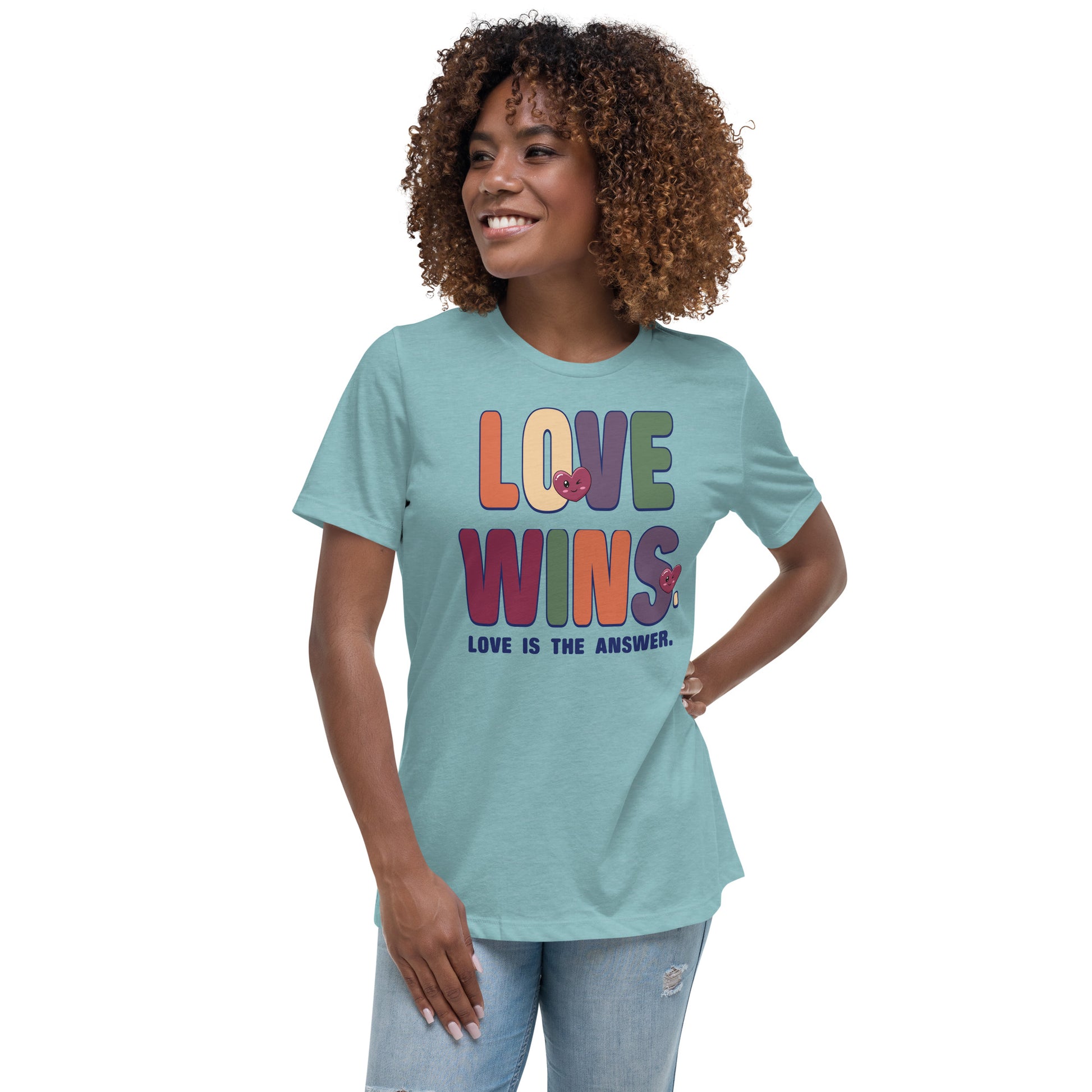 LOVE WINS. LOVE IS THE ANSWER T-SHIRT. This women's relaxed tee might be the softest and most comfortable t-shirt you'll ever wear. Under the Natureful Soul private label, it is made of preshrunk fabric made from 52% cotton, 48% polyester in 4 colors: heather mauve, heather blue lagoon and white, or athletic heather is 90% cotton, 10% polyester.