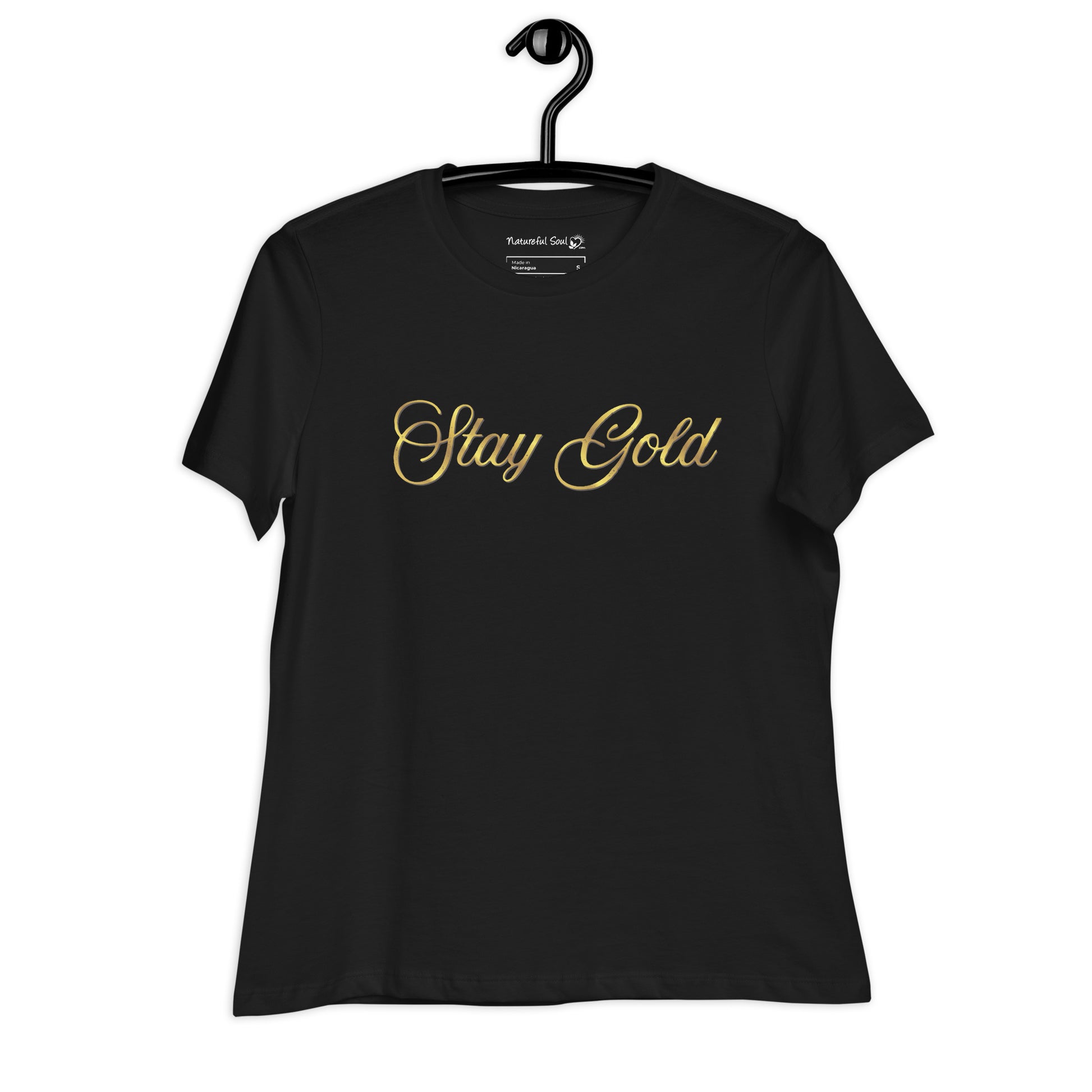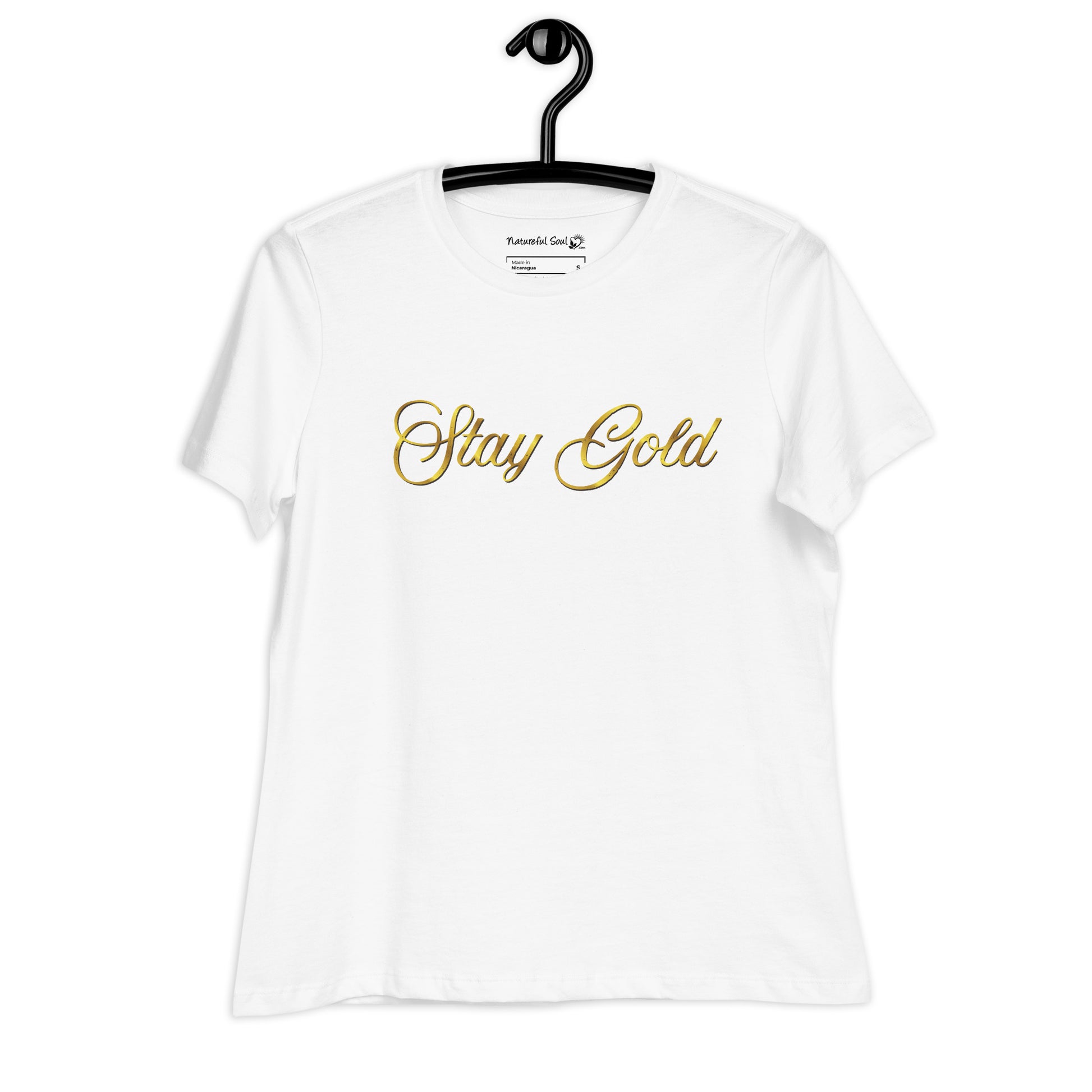 STAY GOLD T-SHIRT. This unisex t-shirt is soft and comfy, with the right amount of stretch making it flattering for all. Under the Natureful Soul private label, it is made of lightweight, pre-shrunk fabric from 100% combed and ring-spun cotton. Choose from 4 colors: black, white, heather mauve, heather blue lagoon.