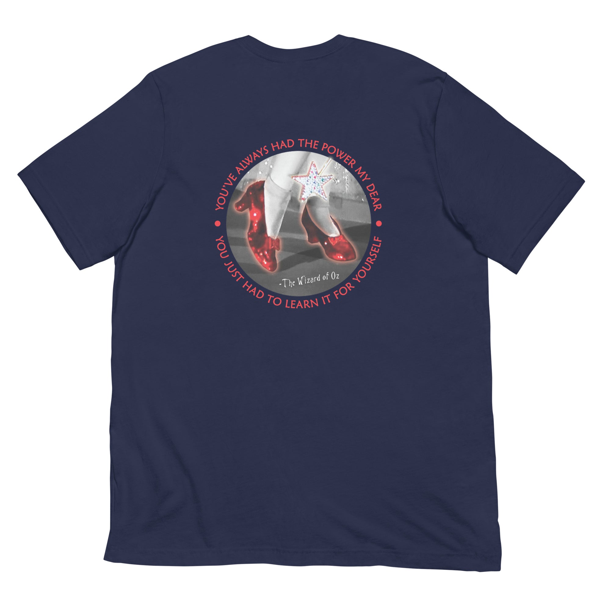 YOU'VE ALWAYS HAD THE POWER MY DEAR, YOUU JUST HAD TO LEARN IT FOR YOURSELF. - GLENDA. (back design). This unisex t-shirt is soft and comfy, with the right amount of stretch making it flattering for all. Under the Natureful Soul private label, it is made of lightweight, pre-shrunk fabric from 100% combed and ring-spun cotton. Choose from 4 colors: black, asphalt, navy or ash.